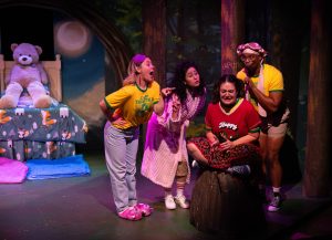 Under Theatre Lab Producing Artistic Director Matt Stabile’s over-the-top, playful direction, the production features a cast of performers unafraid to appear silly in front of the audience. The cast, which mostly plays children, comprises Pryscila Cassiano Salinas, Brendan Feingold, Dayana Morales, Casey Sacco, Heather Simsay, Randall Swinton, and Casey Venema. Stabile and the cast lean into camp rather than realism. This signals that the audience should enjoy the action rather than take it too seriously.